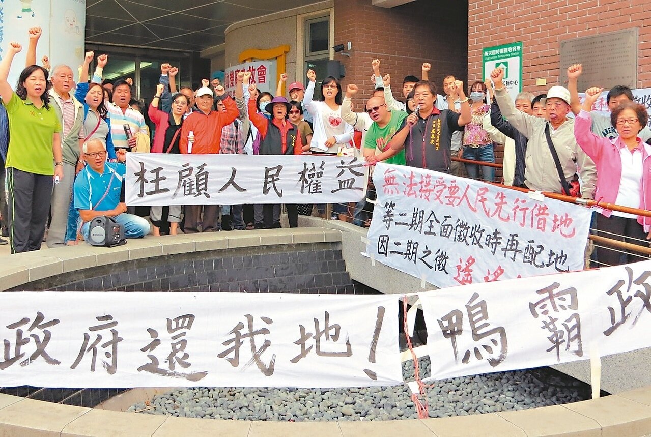新北市捷運工程處昨天舉辦淡海輕軌捷運機廠用地徵收說明會,預計在淡海新市鎮沙崙路、新市六路口徵收6公頃私有農地,部分地主恐權益受損,拉白布條抗議要求擴大徵收範圍、優先配地。