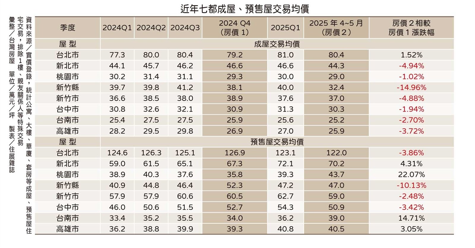 本刊委請台灣房屋統計限貸令前後七都房價漲跌情形,結果發現,無論是預售或成屋市場,目前新竹縣、市與台中市皆呈現雙雙下修,已成「雙降區」。成屋市場中,僅台北市仍勉力守住微幅上漲。但整體看來,限貸令後遺症持續發酵,實際交易現場已悄然出現轉向跡象。