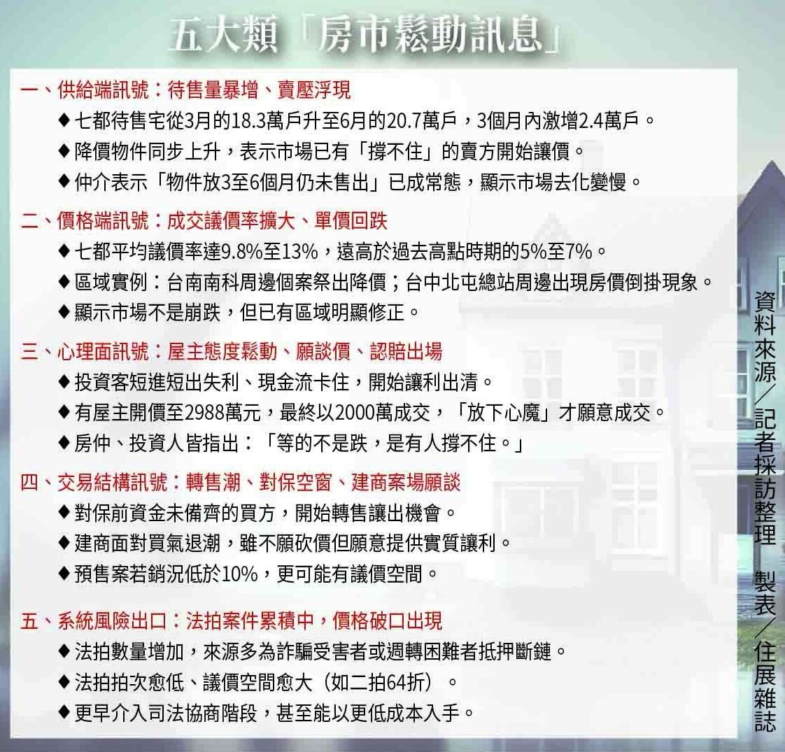 除了數據上的變化,放眼整體市場,房市鬆動的訊息正從不同面向浮現。《住展》歸納起來,包括:供給賣壓、價格鬆動、賣方願談、預售讓利、對保前的議價空窗及資金斷鏈等逐漸浮現。