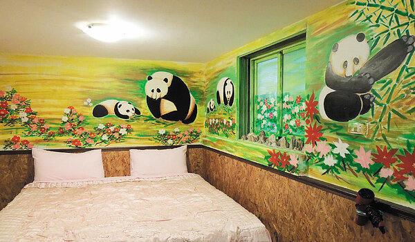 近年潘鳳嬌習畫自怡,也將作品帶進民宿,去年10月起利用農曆年前淡季,動手彩繪花草在民宿外觀,每個民宿房間畫上夏威夷草裙舞、山水扁舟、花草、熊貓、櫻花等主題,改變房間氣氛,不少熟客回到欣園民宿,充滿驚喜。
