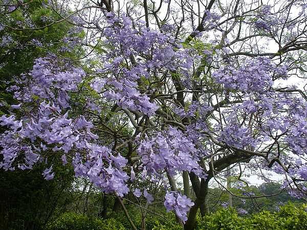 台中市鐵砧山特訂風景區,從元月起至今,先是粉紅的櫻花、金黃色的「相思花」,隨即開著紫色花朵的藍楹樹及油桐花,自然美色不間斷,遊客置身在寧靜的山區,看樹花開別有一番閒情逸緻。