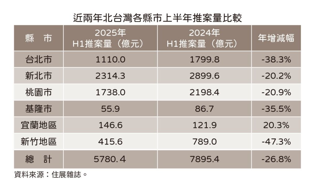 趨弱的房市讓建商不敢冒進,住展雜誌統計今年上半年北台灣新成屋、預售屋推案量,合計約5780.4億元,較去年同期減少2115億元,減幅26.8%。各縣市中僅宜蘭地區一枝獨秀有20.3%的增幅,而新竹地區、台北市衰退最多,年減幅為47.3%與38.3%。