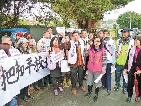 第二殯儀館進行整建工程,擬借和平高中校地闢作臨時停車場,和平高中家長會與市議員陳孋輝(右四)昨上午出面抗議。(記者江慧珺/攝影)