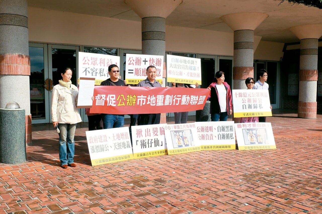 由10個宜蘭公民團體組成的「督促公辦市地重劃行動聯盟」群起抗議,批評議員不該刪除預算,昨天向縣府陳情,強調縣府應該堅持公辦立場,才能漲價歸公,同時強調整起事件黑幕重重,傷害縣政府及議會,要求縣府應公開宣示,「往後市地重劃案均採公辦方式」進行,不再接受申請自辦市地重劃。