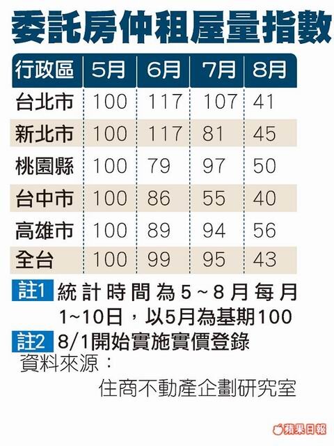 住商不動產調查全台主要都會區5~8月租屋委託量發現,實價登錄實施後全台平均委租量瞬凍,和5月實價登錄議題發酵前比較,大幅縮減5.7成,其中雙北市與台中萎縮幅度最高,均較5月同期減少近6成。