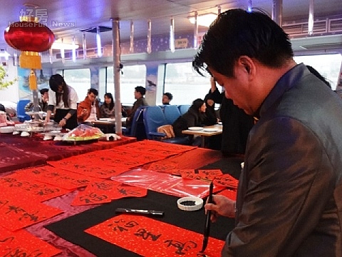 為迎接萬馬奔騰馬年到,高雄市輪船公司在春節之前周末假日,首度在「觀光遊輪.海上饗宴」餐船上舉辦4場次「大師寫春聯」,不只書法大師初次體驗在遊輪上揮毫新鮮感,遊客在船上欣賞大師旋腕運筆真工夫,小朋友甚至拜大師為徒,請教如何寫一手好字,現場互動十分熱絡, 70多幅吉祥喜慶的春聯,為遊客帶回家中除舊佈新,祈福新春如意。該活動25及26日將再舉行2場次,歡迎民眾在餐船上感受不同的年味。