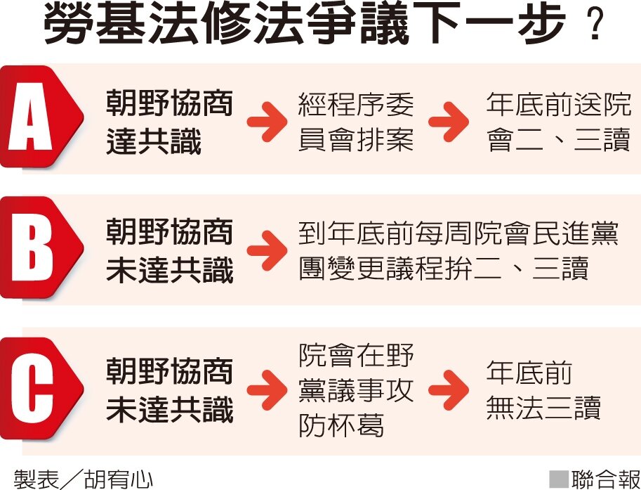 若依民進黨立院黨團宣稱十月五日已完成勞基法修法初審,至今已超過協商冷凍期一個月,但因勞團、在野黨團抗爭,加上外界爭議不斷,民進黨團態度有軟化跡象,黨團總召柯建銘昨受訪表示,願意請立法院長蘇嘉全主持公聽會討論法案爭議,或是勘驗錄影帶協調議事錄。他並允諾本周不排案,也沒變更、增加議程的選項。