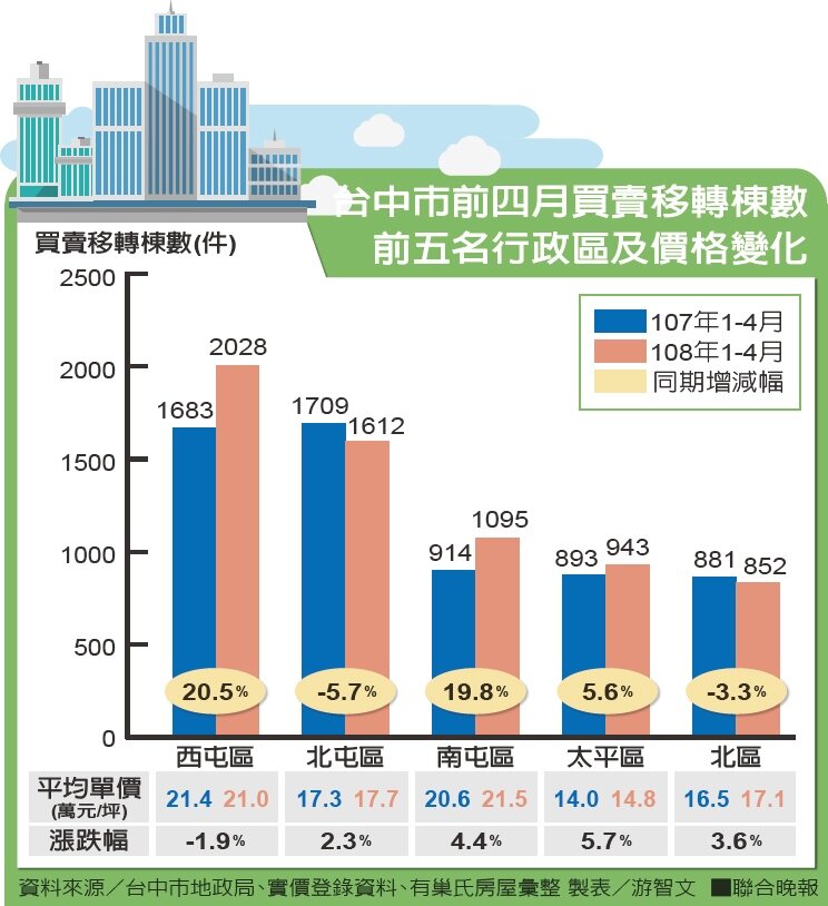 觀察台中市今年1-4月買賣移轉棟數前五名行政區,西屯區和南屯區成長較明顯,西屯區今年前四月交易量2028件,較去年同期增加20.5%,南屯區從914增至1095件,增幅也近兩成。