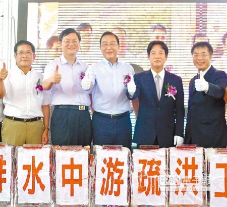 杜紫軍(左二)任經濟次長時,與台南市長賴清德(右二)主持港尾溝溪疏洪道啟用儀式。(記者曹婷婷/攝影)