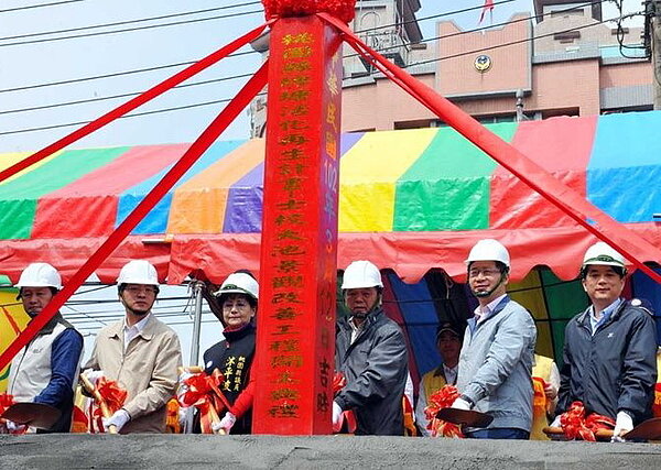 士校大池景觀改善工程由縣長吳志揚、中壢市長魯明哲、石門農田水利會長莊玉光等多位來賓進行開工動土典禮。(記者吳世傑攝)