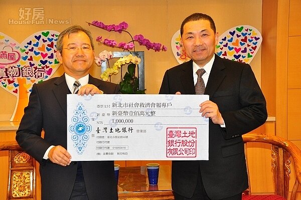 台灣土地銀行17日捐贈新北市政府100萬元,響應「幸福滿屋、實物銀行」,供市府做為「高齡照顧存本專案」之用。該捐贈由土銀副總經理朱玉峯,率業務部經理舒誠平和板橋經理劉與鵬等人,將100萬元支票交由副市長侯友宜,侯友宜並頒贈感謝獎牌,謝謝土銀的愛心。朱玉峯說,「高齡照顧存本專案」具有存、提的觀念和做法,就像銀行的功能一樣,土銀非常高興能參與其中,善盡社會企業的責任。