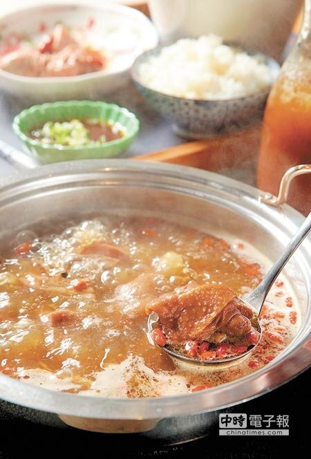 陳盈昌表示,春囍花雕養生雞鍋以大骨高湯為底,加入人蔘、枸杞、當歸等八種中藥材和花雕酒熬煮,其實不論湯鍋還是乾鍋,兩種湯底幾乎大同小異,差別只在於乾鍋會用蠔油炒過。為方便客人點餐,春囍將港式火鍋做成套餐形式,套餐包含菜盤、肉盤、飲料和白飯或冬粉二選一,一份花雕雞鍋約有5塊以獨門醬料秘製的生雞肉塊,就跟平常吃火鍋一樣,把雞肉放進鍋湯裡燙煮,雞肉的肉質Q嫩,並帶有濃濃的花雕酒香,湯頭本身也很鮮郁。