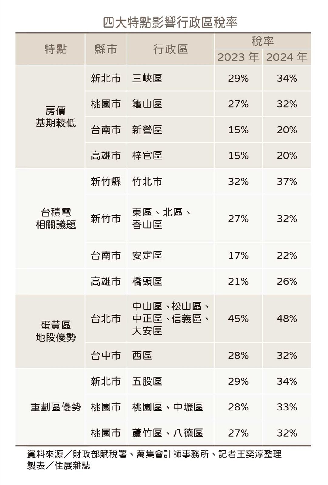 從新規定調整各行政區的房屋交易所得計算標準也可見端倪。在普遍調升比率、最高達5%的情況下,萬集會計師事務所會計師鄭鈺樺表示,預計新北市、桃園市等地區最受影響。觀察房屋交易所得計算比率調高較多的行政區,可歸納出其中具備四大特點。