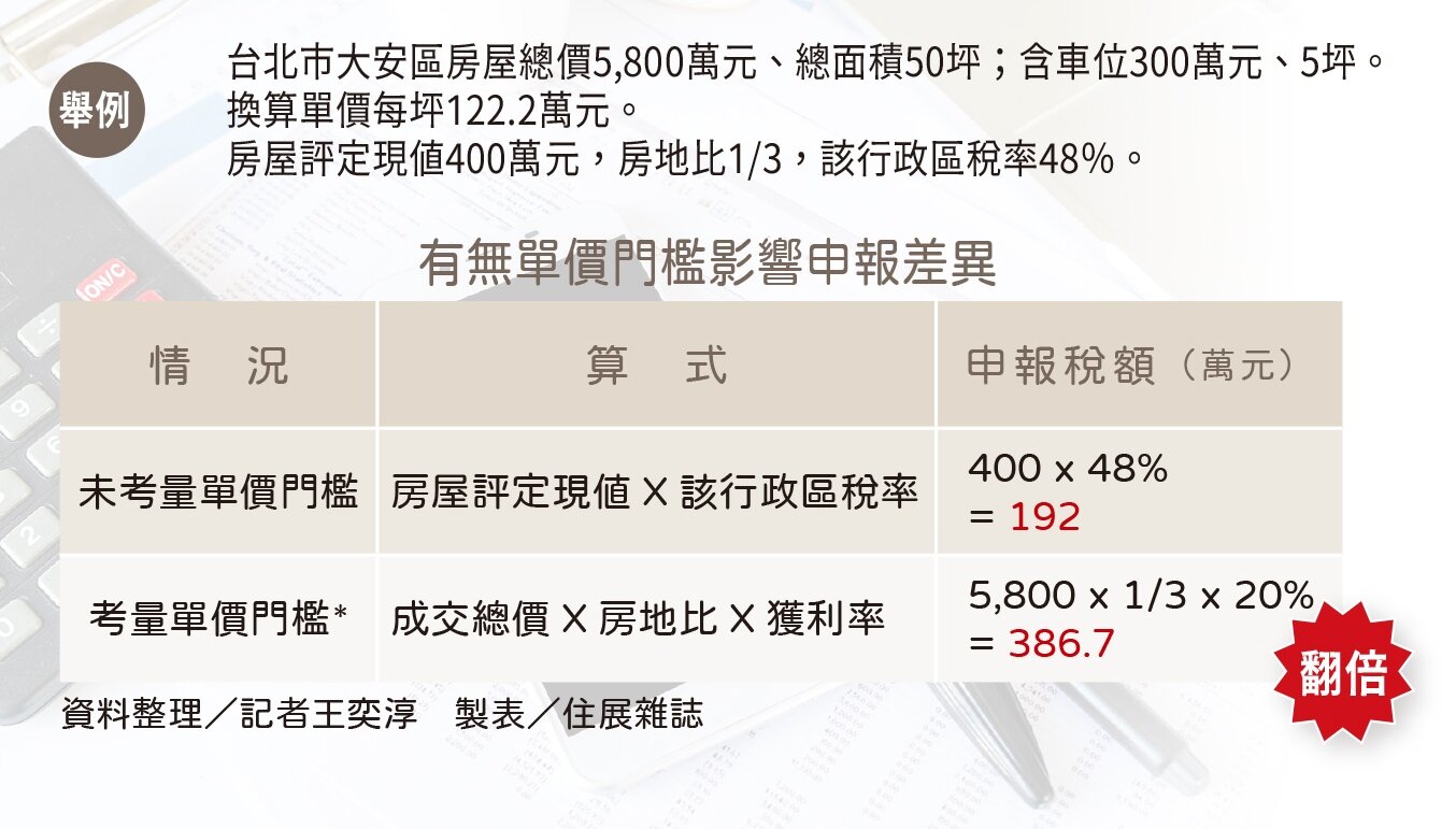 在新規定納入單價條件之前,因為該筆交易尚未達到台北市總價6000萬元的豪宅稅門檻,所以要以非豪宅的標準計算,算式為「出售當時的房屋評定現值X該行政區房屋交易所得計算稅率。」,即400萬元X48%,得出所得申報稅額為192萬元。