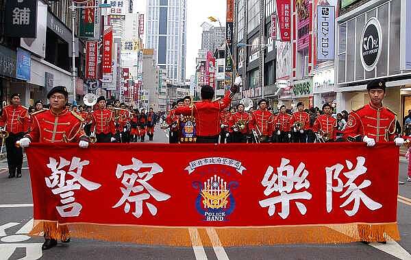 新北市歡樂耶誕踩街嘉年華會,23日下午在市長朱立倫搖響象徵快樂幸福的平安鐘聲中揭開序幕,一路從府中商圈熱鬧開走,34支創意隊伍沿中山路至市民廣場,首先登場的是英姿煥發的騎警隊,訓練有素的馬匹整齊劃一的隊伍,受到民眾歡呼手中相機閃不停,接著上場的是全國首創警察大樂隊,大跳騎馬舞贏得群眾掌聲肯定叫好。