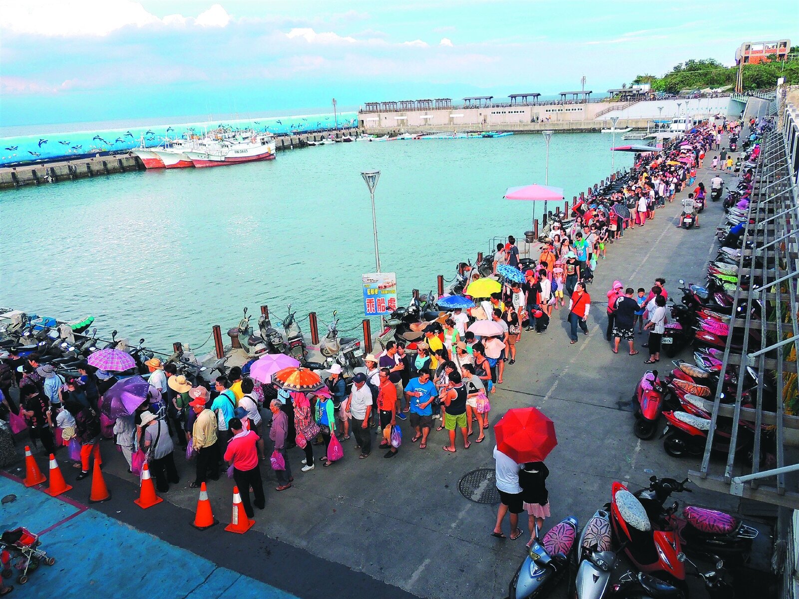 每逢假日,琉球候船室外湧現長長排隊人龍。(記者張進安/攝影)