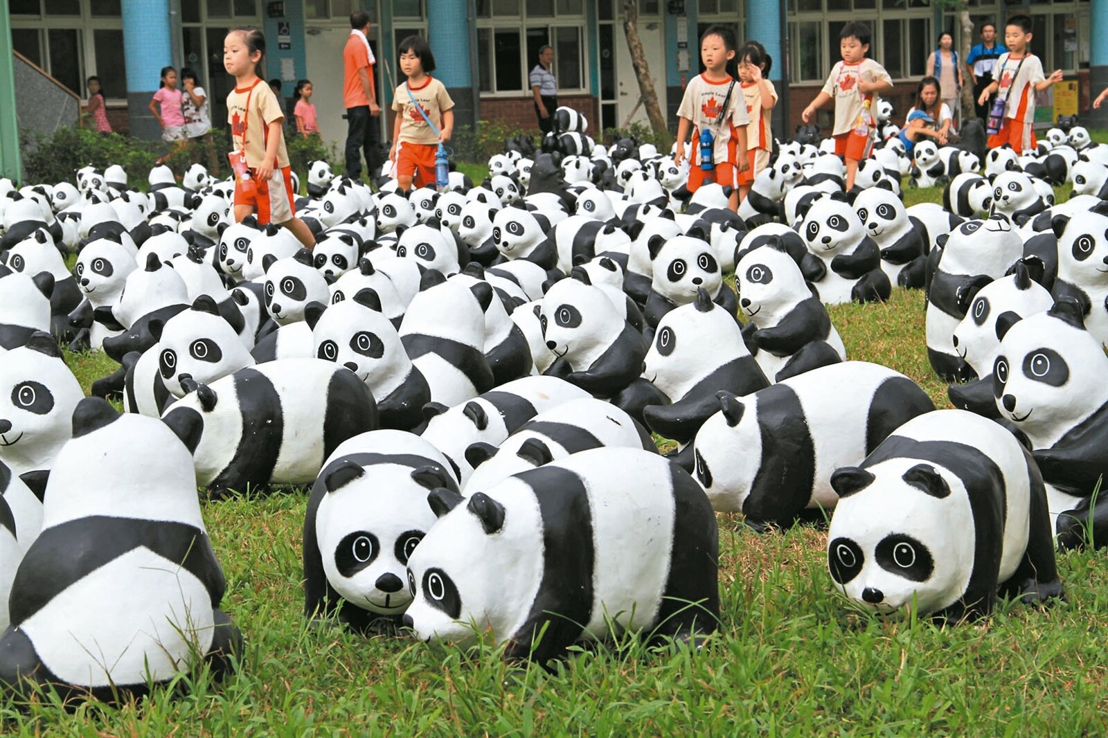 「黑白雙熊全台趴趴走」巡迴校園,昨天抵達宜蘭縣員山鄉湖山國小,700隻紙模貓熊與100隻黑熊在操場草地或疊或趴「日光浴」,萌翻全校,民眾也驚喜到場欣賞。