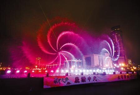 基隆中元祭水燈大遊行20日在基隆市區盛大舉行,首度結合水舞燈光秀及投影技術,透過變化萬千的水幕為遊行揭開序幕,吸引許多民眾特地前來圍觀。(記者鄭任南/攝影)