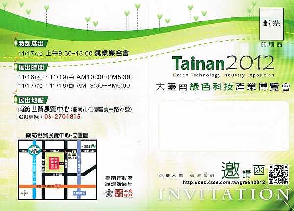 匯聚了將近120家綠能廠商、規模達330攤位的 「2012年大台南綠色科技產業博覽會」,將自11月16日起至19日為期4天,於台南市仁德區南紡世貿展覽中心盛大舉行,參觀時間平日上午10點至下午5點半;假日上午9點半至下午6點,民眾可免費入場、自由參觀。