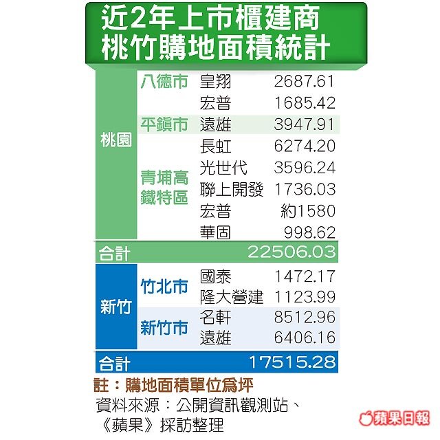 統計2011~2012上市櫃建商購地,桃園有皇翔、宏普插旗八德市,遠雄看好平鎮市,長虹、聯上開發、中華電信旗下子公司光世代、宏普及華固等,則搶進桃園高鐵特區;總計花費87.38億元取得逾2萬坪土地,其中以長虹擁有約6274坪土地最多。