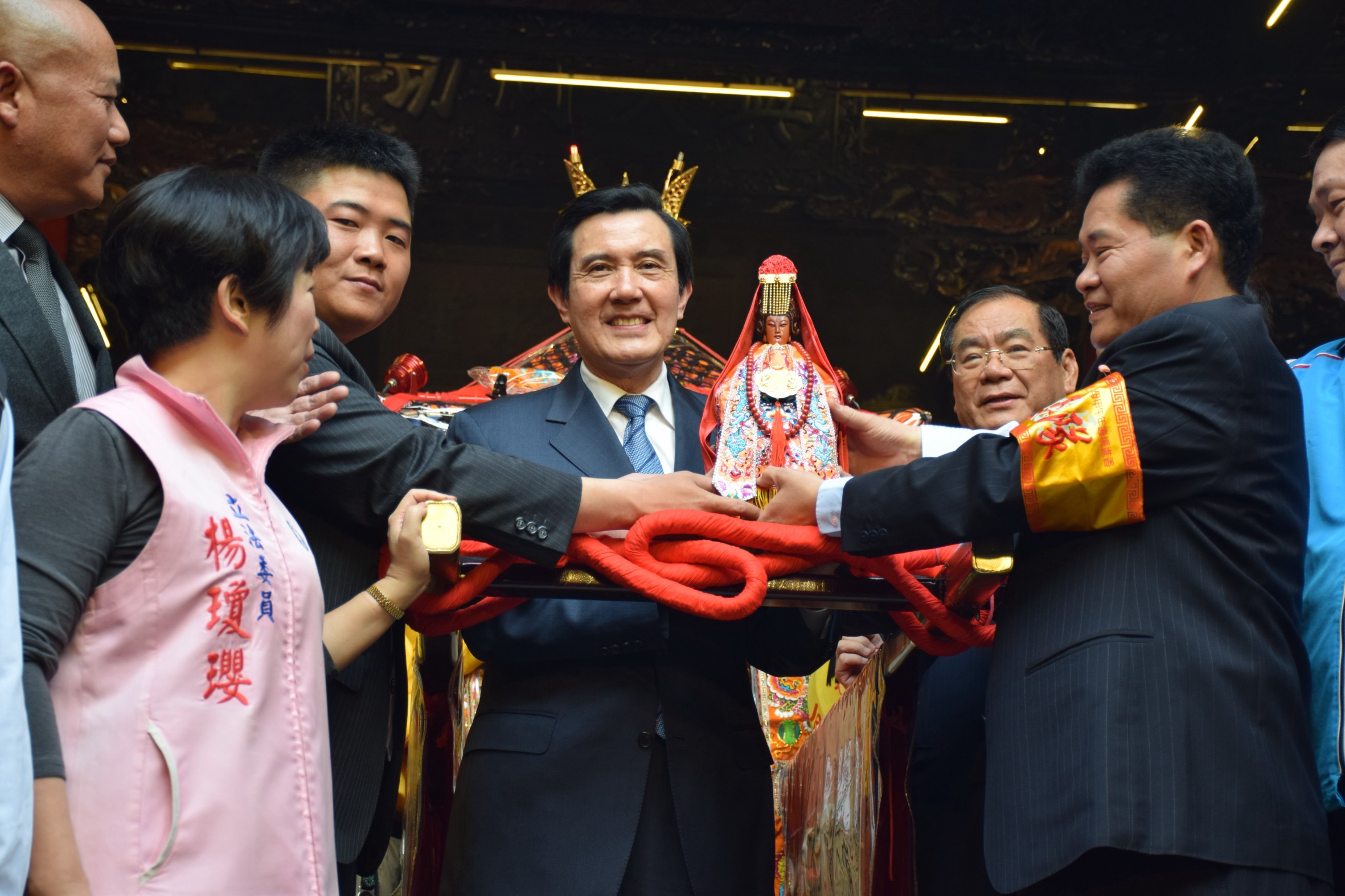 總統馬英九6日下午蒞臨大甲鎮瀾宮,主持大甲媽祖9天8夜遶境進香之媽祖神尊等入座神輿大典,儀式莊嚴隆重,馬總統肯定大甲媽的遶境的熱況,已是世界三大宗教盛事之一,信眾高達二億人,馬總統以輕鬆的心情,用媽祖為題與民眾做有獎問答,引來不少搶答,場面溫馨。