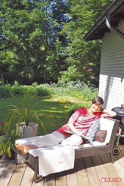 加設木平台之後,後院成為Manuela一家人最喜歡的地方,可以用餐、交誼、烤肉、看雜誌,甚至還有個吊床呢!單人椅可自由組合。(記者洪儷容/攝影)