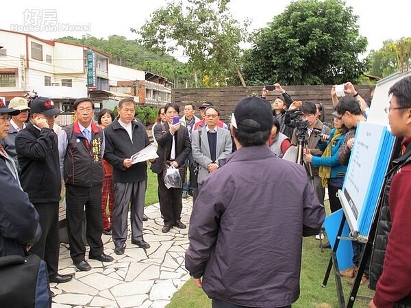 交通部長葉匡時〈前排左2〉帶領相關部會官員實地視察集集龍泉火車站,立委林明溱〈前排左3〉、集集鎮長嚴鴻邦〈前排左4〉等人,一起在龍泉火車站前廣場聽取簡報。