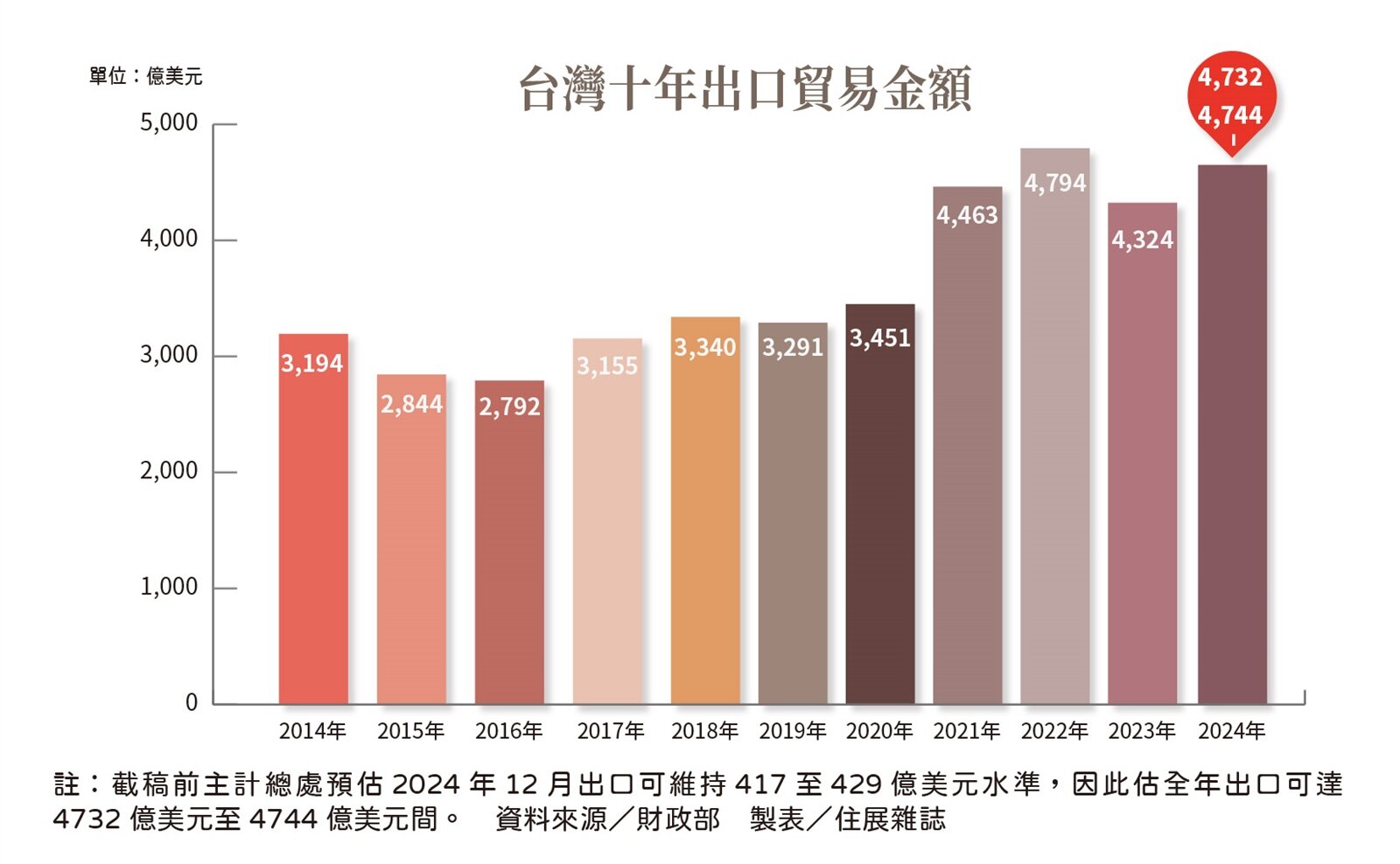 2024年國際情勢動盪,烏俄戰爭引發全球供應鏈大亂,美國總統唐納.川普即將回鍋白宮,揚言揮動關稅大刀,各國繃緊神經,不過台灣景氣反而抗震,於截稿前中央銀行預測全年經濟成長率上修至4.25%,創下3年新高,非但位居亞洲四小龍之冠,還高於全球平均值。
