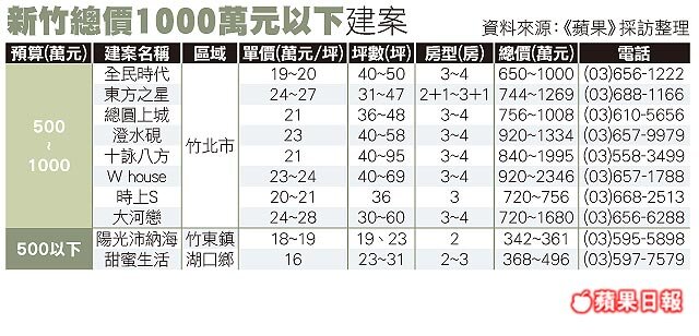 圓石灘廣告襄理林亮安表示,新竹市區精華區土地日漸稀少,不僅建商多規劃換屋型產品,新案開價也站上3字頭。但除了新竹市以外,其它地區可說是任君挑選,林亮安建議,總價500~1000萬元,民眾可選擇竹北市「台科大」、「縣治三期」、「高鐵特區」購屋,預算若在500萬元以內,則可考慮往湖口、竹東等地。
