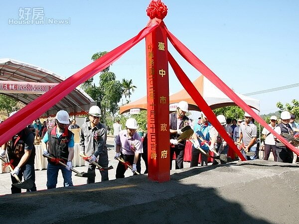 東勢林場聯外道路拓寬工程,由市長胡志強(左三)與地方各界人士共同進行動工儀式。(記者黃玉鼎攝)