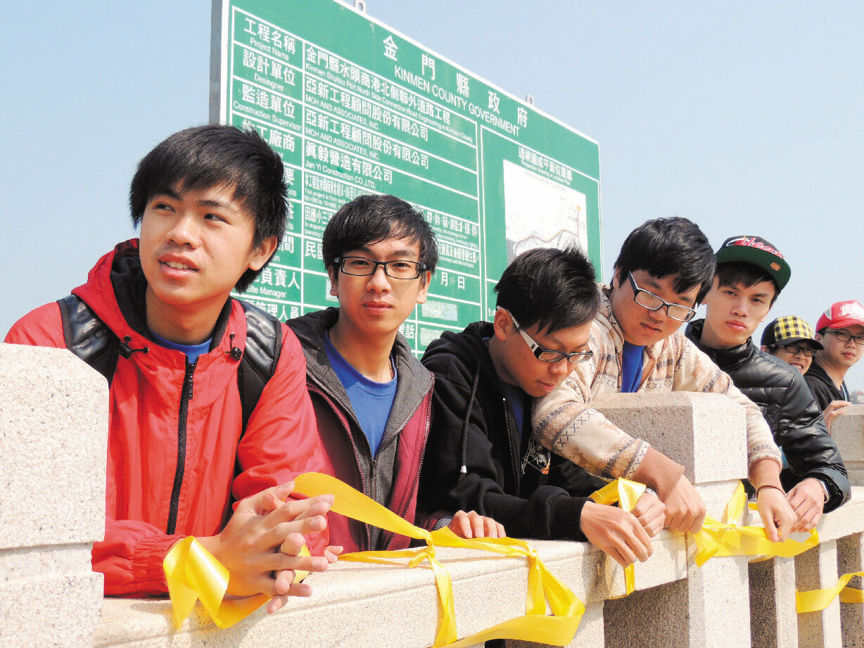 水頭港聯外道路工程恐破壞浯江溪口生態爭議持續延燒,30餘位金門大學學生昨前往現場排出「SOS」字樣,同時繫上黃絲帶,呼籲更多鄉親共同關懷「母親河」的保育問題。