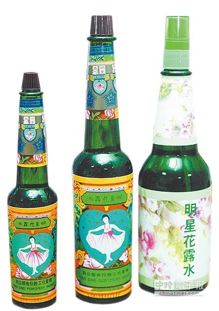明星花露水從清光緒33年(西元1907年)推出至今已有百年歷史,玫瑰香精與茉莉香精的調配比例,以及包裝上舞衣女孩的羞澀笑容,是長輩們最有味道的記憶。早期被當作香水,後來因為酒精濃度高,被許多婆婆媽媽用於消毒或噴灑在浴廁當除臭劑。