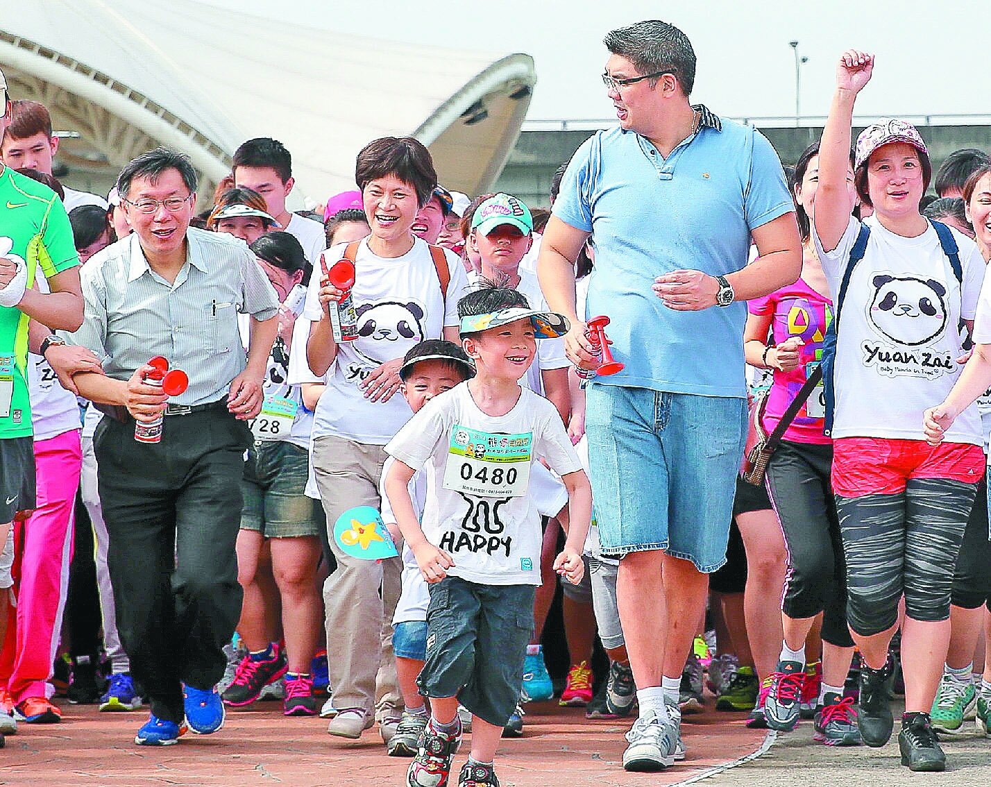 台北市長參選人連勝文(右)與柯文哲(左)昨難得同台,參加自閉兒慢跑公益活動,還一起鳴槍開跑。連勝文高頭大馬,一身休閒裝扮,個頭較小的柯文哲則身著襯衫西褲,形成強烈對比。(記者程宜華/攝影)