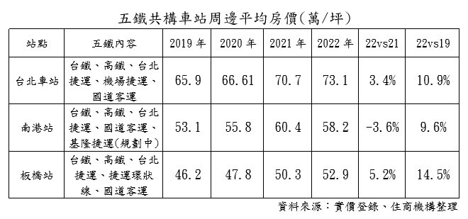 交通利多是成就區域發展的重要關鍵,多鐵共構無論在話題性及便利性都能吸引購屋置產,房仲業者依據實價登錄資料統計有五鐵的台北車站、台北市南港站及新北市板橋站周邊房價,發現從2019年房價一路成長,4年漲幅都在1成上下,但到了2022年價格走勢出現分歧,台北車站及板橋站持續成長,板橋站去年均價每坪52.9萬元、年增5.2%,跟2019年相比則是大幅增加14.5%,為五鐵共構站點價格最低、漲幅最大的一站,至於南港站周邊房價則是在去年出現回檔,與去年相比下修3.6%。