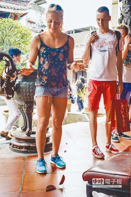 隨後,荷蘭10多名隊員繼續前往霞海城隍廟,吸引許多路上行人圍觀拍照。女子50公尺仰式金牌得主Toussaint Kira Marije也在廟方帶領下體驗求紅線,她笑說,聽說這間廟求姻緣很靈,還可以跨海牽線,如果有效,一定會回來還願。