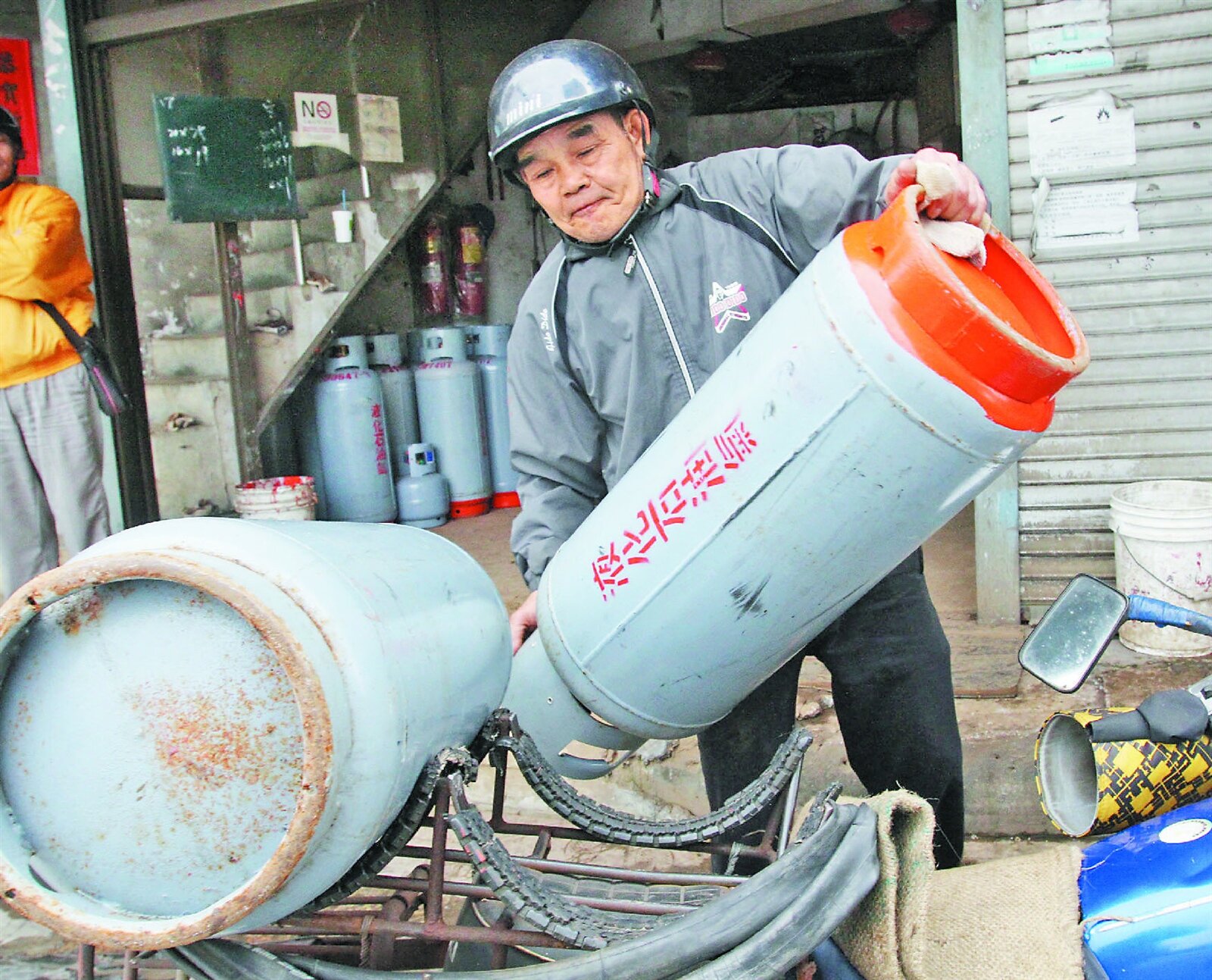 舊的笨重,傳統瓦斯鋼瓶雖然成本較低,但裝滿後重達四十公斤,瓦斯行現在已很難找到年輕人來當扛桶工人。(本報資料照片)