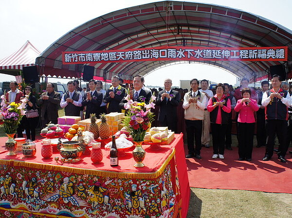 新竹市南寮地區天府路出海口雨水下水道延伸工程開工祈福典禮,10日上午在天府路出海口舉行祈福儀式,附近居民以辦喜事的心情出席,期待雨水下水道延伸工程在今年6月完工後,不用再飽受水患之苦。