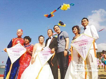 新北市石門國際風箏節27、28日兩天在白沙灣舉行,活動首日,各式造型風箏冉冉升空,吸引數千民眾前往觀賞,還有3對因為風箏結緣的愛侶在新北市長朱立倫見證下,將寫著承諾的結婚風箏放上天,甜蜜指數也隨風箏升起,羨煞旁人。