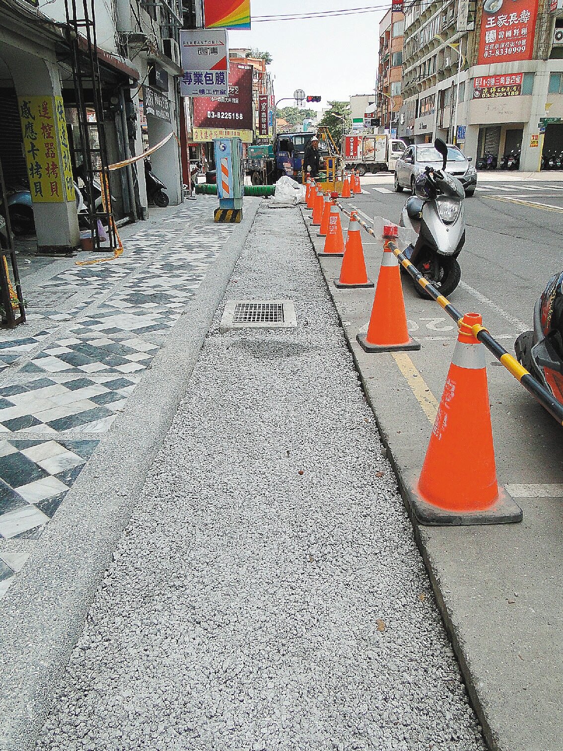 田智宣說,「透水性路面新工法」比起傳統工法多出三分之一的工程費,可有效解決路面積水,進而消弭雨水倒灌民宅夢魘。市公所由縣府協助獲得營建署補助1800萬元,進行林森路人行道重鋪及街道排水系統工程,一旦新工法成效良好,全市街道將逐年、分期比照改善。