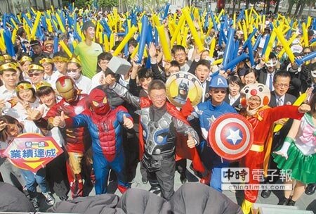 各大百貨公司周年慶活動陸續登場,台中市大遠百24日舉行周年慶誓師大會,高階主管們以電影英雄裝扮帶領員工高呼口號提振士氣。(截取自中時電子報)