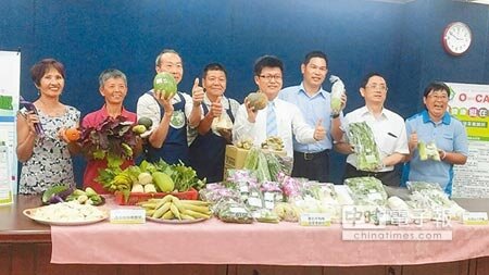 台北市產發局推出有機農地認養活動,讓市民朋友能親手種出安心的蔬菜,1日記者會請北市有機農場主人帶來有機農作物合照。 (記者邱文秀/攝影)