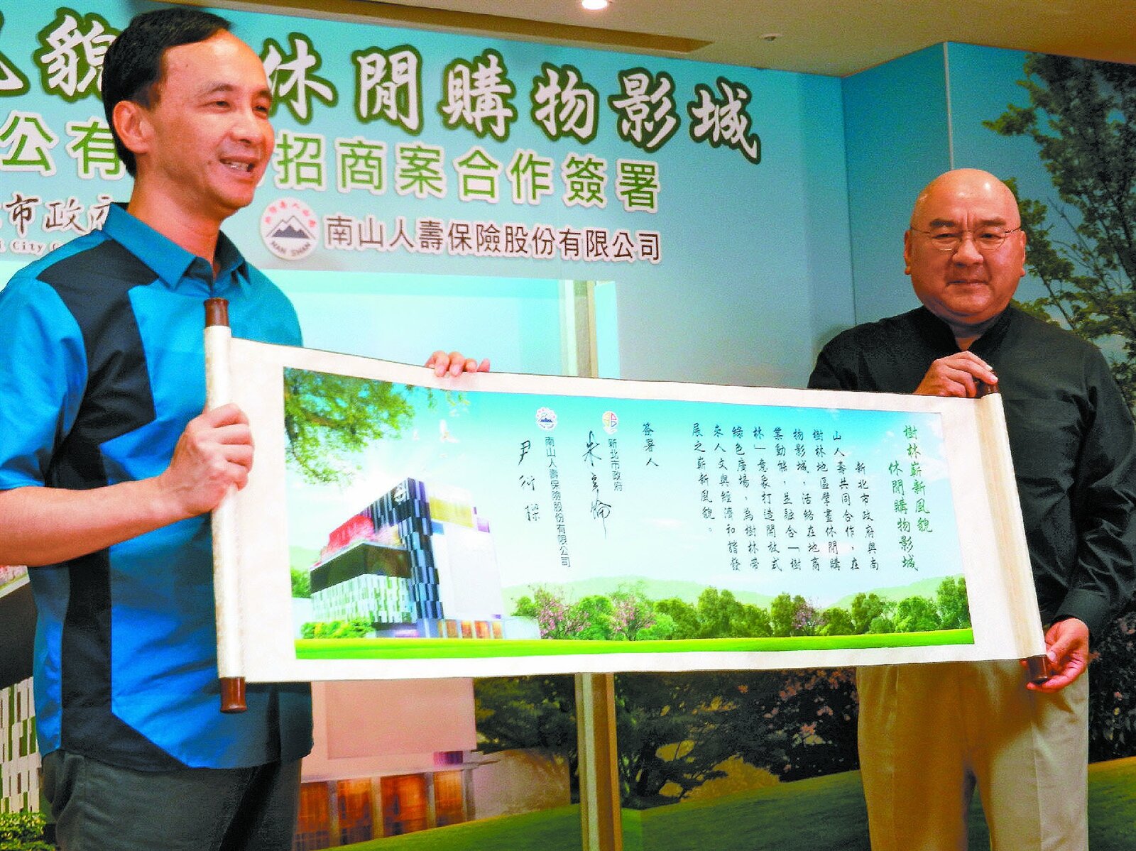 2017年樹林將有休閒購物影城,新北市長朱立倫(左)與南山人壽常務董事尹衍樑(右)昨簽署合作協議。(記者呂思逸/攝影)