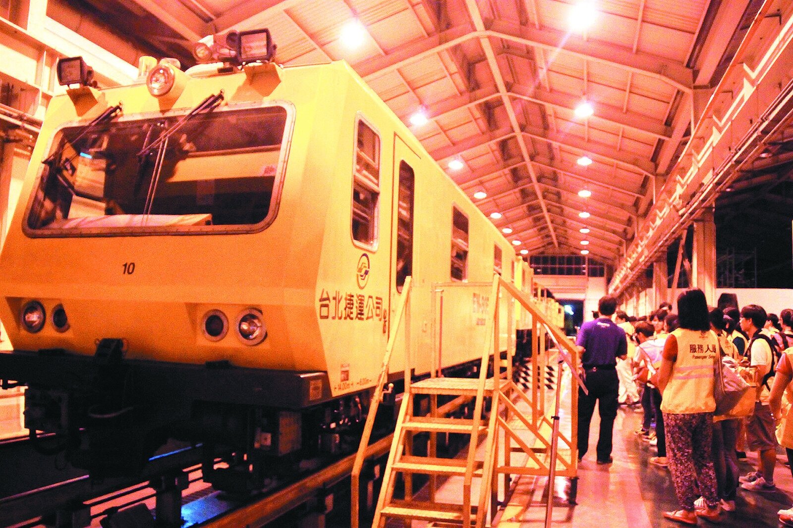 台北捷運前天深夜首度舉辦「夜探捷運機廠」的活動,帶民眾進入北投機廠,喜愛捷運的參加者看到列車都猛拍照。(截取自聯合新聞網)