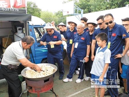 昨日新嘉國小以傳統的民俗藝陣宋江陣,迎接遠從土耳其來台的布薩爾劍盾舞協會,宋江陣特殊的兵器及盾牌,引起土耳其團隊的興趣,協會成員紛紛下場與學童比畫,切磋技藝。