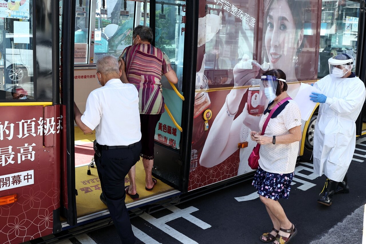 南機場某國宅爆發社區感染,台北市府昨天以防疫專車接送居民到聯合醫院篩檢。圖/記者侯永全攝影