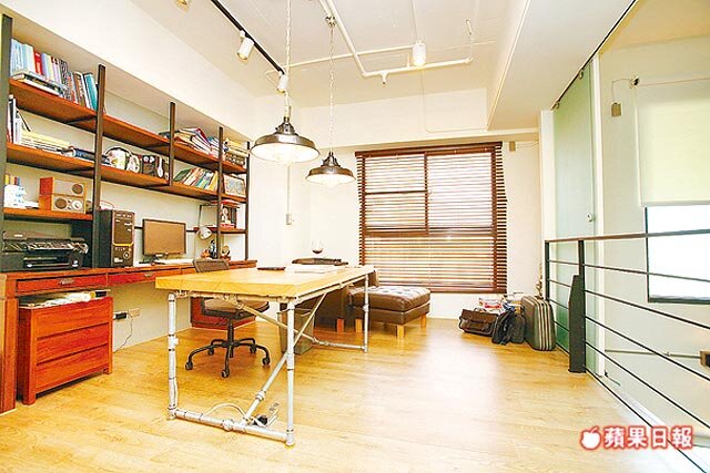 書房充滿工業風,排列整齊的天花板管線走直角,吊燈和訂製桌都很有型。