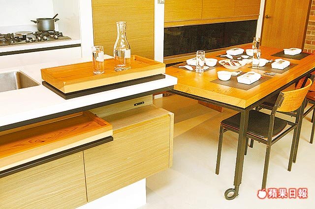 客廳和餐廳被做成一個通透的大空間,以地板材質和高度來做區隔。客廳的地板使用了比利時QuickStep超耐磨地板,廚房則是磐多魔,有著類似水泥粉光的外觀,但是質感加倍,不會裂開。長長的中島是賴慶鴻最喜歡的地方,他常坐在那裡,邊品紅酒,邊欣賞客廳窗外的景色。