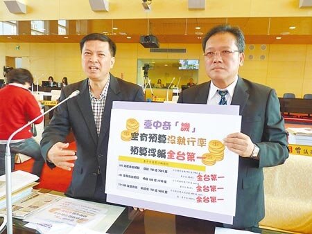 「預算浮編、全台第一!」林汝洲痛批市府103年度預算歲入編937.61億元,歲出編列1120.21億元,用舉債來因應;市長34項重大建設,尚有26項未達目標,保留數及剩餘數是全國最高,全國才732億元,中市就高達108億元。