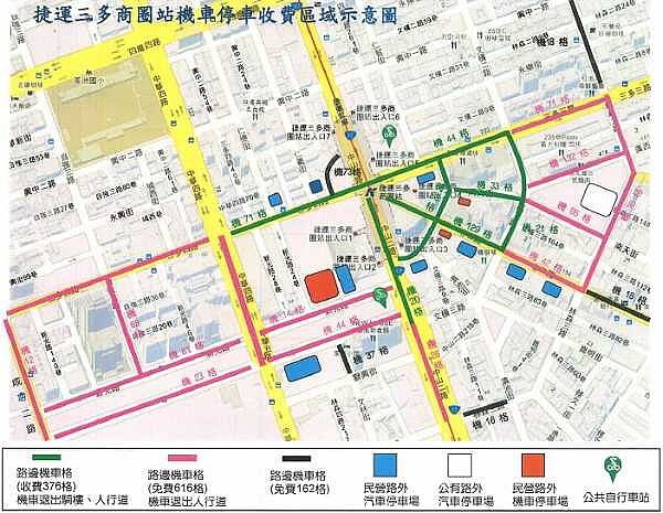 捷運三多商圈站周邊機車停車訂於3月18日開始收費,收費路段為三多三、四路(中華路-文橫路)、中山二路(三多路-文橫路)、一心二路(三多路-文橫路)、文橫三路(三多路-一心路)、南天街(三多路-文橫路)、三多三路223巷及中山二路258巷,收費時間為週一至週日8時至22時,採計次15元(隔日另計),另亦出售300元機車停車月票以滿足有長期停車需求的當地商家及住戶。