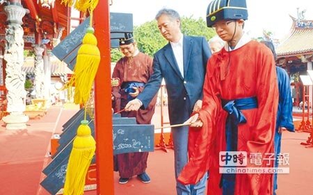 台北孔廟昨舉行贈磬儀式,贈磬者前田宗一(中)、孔廟樂長孫瑞金(左)與樂生一同擊磬啟用。